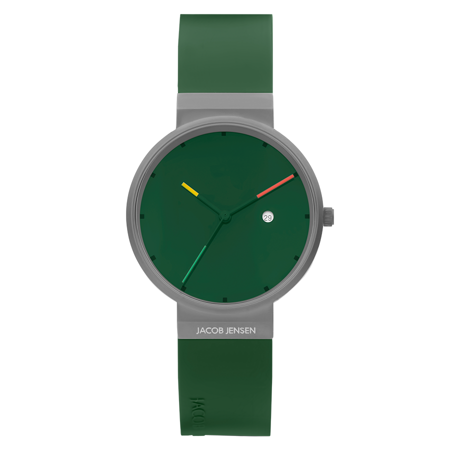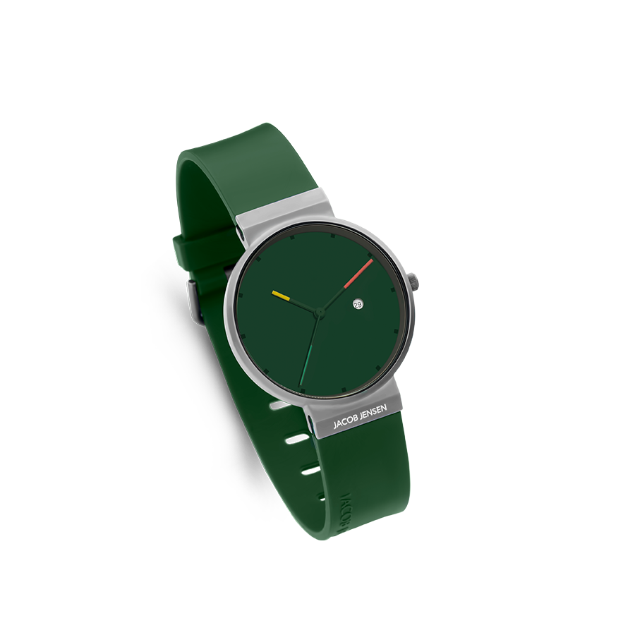 The Titanium 643 Men's Watch series by Jacob Jensen combines an all green dial and rubber strap with an illustrious silver titanium case. As it's highly regarded and made of high-quality materials, this watch will quickly become a wardrobe staple.